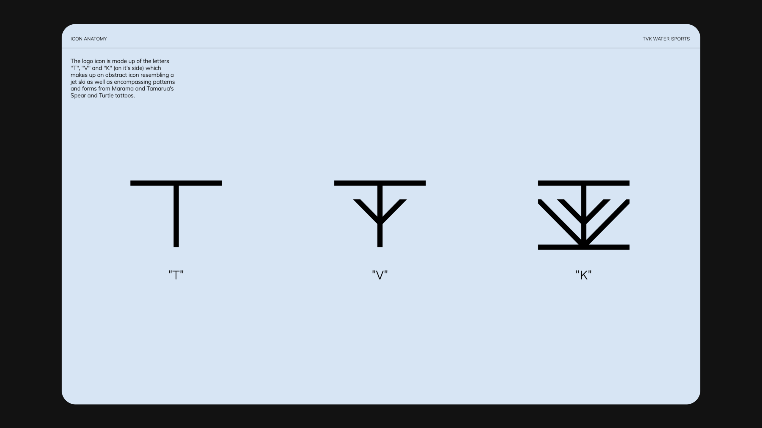 It was important to highlight their passion, values and culture while keeping the overall aesthetic modern and luxurious. Guided through their engraved Tatau (tattoo in Cook Islands Māori), we created an icon that encompasses the letters "T", "V" and "K" which forms a jet-ski like form as well as referencing their deep cultural roots. It is a unique icon that authentically represents them while showing they offer an exceptional service and experience to their guests.